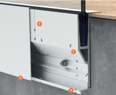 1. Das äußere Abdeckprofil für die Vorsatzmontage wird am Bodenprofil eingehängt und auf der Unterseite mit M4-Gewindestiften fixiert. Es übernimmt die vollflächige Verblendung des Systems und bildet zugleich die konstruktive Basis für die Entwässerung im Außenbereich.