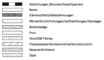 Die Legende dient der Orientierung und ersetzt keine projektbezogene Detailplanung. Sie unterstützt das Verständnis für die Systemlogik und die Schnittstellen zwischen Ganzglasgeländer, Abdichtungsebene und angrenzenden Bauteilen.