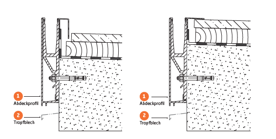 2. Abhängig von den baulichen Gegebenheiten kann ein zusätzlicher Schutz der Fassade erforderlich sein. In solchen Fällen ist der Einsatz eines ergänzenden Tropfblechs sinnvoll, das den Wasserabfluss weiter von der Fassadenoberfläche wegführt. Ein mögliches Ausführungsbeispiel ist in der Schnittdarstellung schematisch dargestellt.