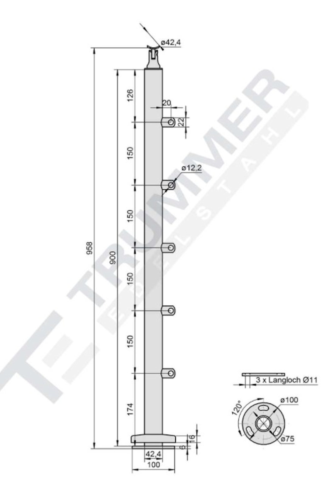 - 6x Edelstahl-Pfosten PF-250 mit 5 Querstabhaltern (inkl. Abdeckrosette und Teileset)